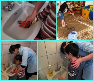 В ходе занятия дети были ознакомлены с моделью санитарно-гигиенического блока, который включает в себя два помещения: ванная комната и туалет. А также были ознакомлены со средствами личной гигиены, санитарно-гигиеническими средствами, бытовой техникой, специальным адаптационным оборудованием, и их применением в быту. Все занятие проходило в игровой наглядной форме, для доступного восприятия материала, а также просмотрели поучительный мультфильм «Мойдодыр».