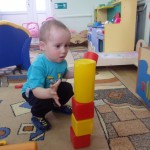 - В центре конструирования имеются различные виды строительного материала (большой и маленький, пластмассовый и деревянный). Совместно с малышами строим гараж для машинки или домик для куклы, башни, ворота. Выше на полке расставлены игрушки, изображения которых соответствуют реальным объектам нашего мира, приближенные к ним по внешнему облику – игрушечные животные, люди, персонажи сказок. Игрушки выполнены из разнообразных, безопасных для здоровья материалов, из некоторых можно извлечь звуки, обследовать поверхность (гладкость, шероховатость), прозрачность, твердость или мягкость.