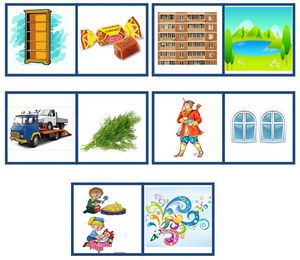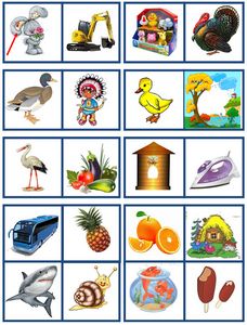 Игра предназначена для детей 4 – 6 лет, представляет собой 25 прямоугольных карточек с двумя картинками на каждой. В названии картинок первые звуки А , О , У , И , Э . Дети должны называть картинки и определять первый звук в слове. Карточки необходимо распечатать на цветном принтере, наклеить на плотный картон и вырезать.