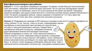 Отварите или запеките в микроволновой печи четыре или пять средних картофелин. В горячем виде кладем в полиэтиленовый пакет и разминаем в лепешку. Выкладываем на подушку и закрываемой фланелевой пеленкой, сложенной вдвое, или махровым полотенцем. Кладем ребенка на спину и размешаем лепешку в области легких и лопаток. Накрываем теплым одеялом на два — три часа. Ребенок вспотеет, поэтому его нужно сразу же переодеть. Затем напоите малыша теплым чаем. Пакет с картошкой можно использовать еще несколько раз, разогревая в микроволновой печи.
