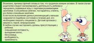 Все знают, что горячая голова означает заболевание и повышение температуры. Нередко молодая мама, обнаружив, что у малыша горячая голова, впадает в панику и вызывает врача. В большинстве случаев вам не стоим беспокоиться, так как у грудничка организм устроен не так, как у взрослого. У него есть характерные только ему болезни и собственные принципы функционирования. Температура тела у него не постоянная, так как процессы терморегуляции еще не сформированы. Малыш должен быть правильно одет, чтобы он не испытывал ни холода ни жары. Не укутывайте ребенка на ночь, так как это может привести к перегреву.
