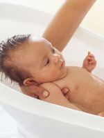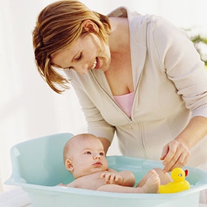 Купают новорожденных в специальной ванночке. Пока малыш еще не держит голову, нужны два человека: мама и помощник (он будет поддерживать шею и спинку крохи). Личико ребенка умывают отдельной чистой водой при помощи ватного тампона или ватного диска. Не наливайте в ванну слишком много воды – это ни к чему. Пусть уровень воды не превышает 12 см. – этого хватит ребенку, который еще не умеет сидеть. Чтобы малыш не замерз во время купания – периодически поливайте его плечики при помощи мягкой губки. Не используйте мыло с сильным запахом – оно может вызвать аллергическую реакцию.
