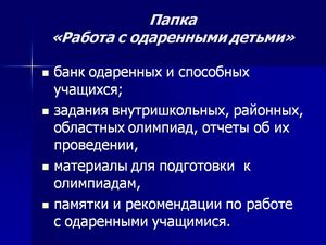 Папка «Работа с одаренными детьми». Банк одаренных и способных учащихся; задания внутришкольных, районных, областных олимпиад, отчеты об их проведении, материалы для подготовки к олимпиадам, памятки и рекомендации по работе с одаренными учащимися.