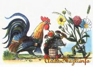 Все колеса в хозяйстве пригодились: Мушка на прялочке нитки прядет, Лягушка с колодца воду носит - огород поливает, Ежик из лесу на тачке грибы, ягоды, дрова возит.