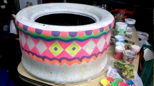 Старые шины надо помыть и почистить. Для чистки можно пользоваться специальным средством для очистки шин -тогда ваша шина приобретет черный блестящий вид. Боковые поверхности шины расписываем акриловыми красками. Для более интересного вида садовой мебели боковые поверхности шин мы можем оклеить дерматином и окрасить его.