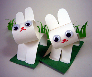 Начнем мы с самых простых поделок из бумаги, сделать которые смогут даже маленькие дети. К 4 годам большинство детей уже умеют вырезать из бумаги ножницами несложные фигуры. Чтобы сделать поделку из бумаги зайчата своими руками, малыш должен вырезать несколько полос бумаги одинаковой ширины. Голова у зайчонка выполнена из полоски бумаги, склеенной колечком. Уши приклеены сверху отдельно. Чтобы сделать лапки, надо на той полоски, которая предназначена для туловища, сделать с обеих сторон небольшие надрезы. Готовую поделку из бумаги надо наклеить на полоску бумаги зеленого цвета - травку .