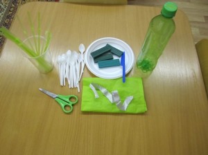 1. Для работы вам понадобится: пластиковая бутылка зелёного цвета, маленькие пластиковые ложки (по 3-4 на один цветок), зелёный пластилин, зелёные трубочки для коктейля (по числу цветков), стека, ножницы, любая обёрточная бумага, ленточка для оформления.