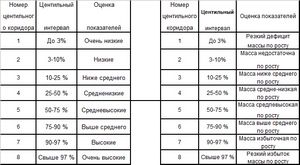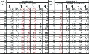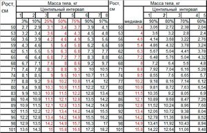 В этих таблицах собраны результаты исследований огромного количества детей. Когда измеряется какой-либо параметр, то следует определить в каком центильном интервале таблицы находится антропометрическое значение.