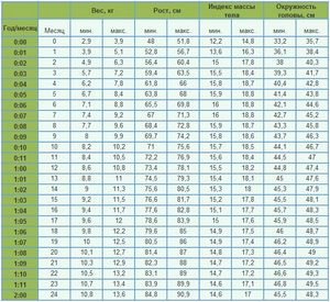 Поскольку самое уязвимое время в развитии малыша составляет до года, то все данные по нему указываются ежемесячно. После года периодичность будет указываться каждые два месяца.