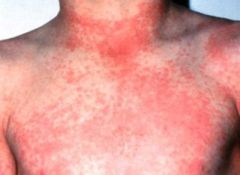 Одним из наиболее часто встречающихся инфекционных заболеваний данного вида бывает корь. При этом вначале высыпания появляются на лице и за ушами, затем распространяются на кожные покровы туловища, рук и ног. Сыпь представляет собой пятна с неровными краями, которые постепенно сливаются. Появлению высыпаний предшествуют симптомы, напоминающие простуду, возникают пятна в ротовой полости, возможен конъюнктивит.