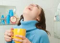 При полоскании голову необходимо запрокидывать назад, при этом язык максимально высовывать вперед для того, чтобы раствор проходил как можно глубже в глотку.- Раствор для полоскания должен быть теплым, так как холодная вода только ухудшит состояние, а горячая вода может вызвать ожоги и лишнюю боль и стресс для больного.