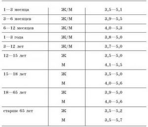 Нормальный общий анализ крови считается тогда, когда количество эритроцитов в крови у мужчин составляет 4,0*10 12 /л–5,5*10 12 /л, а у женщин — 3,5*10 12 /л– 5,0*10 12 /л. У детей в норме количество эритроцитов в крови колеблется в зависимости от возраста, что приведено в таблице.