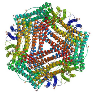 Ферритином называют сложную белковую структуру, функция которой заключается в поддерживании биологически полезного железа в организме. Молекула ферритина способна накапливать до 4500 атомов железа, преобразуя нерастворимое токсичное железо в растворимую нетоксичную форму. Также белок осуществляет транспортировку железа в кишечнике и плаценте (от матери к плоду).