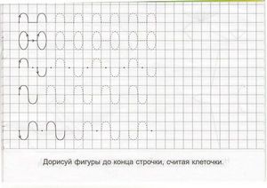 Выполняются на бумаге в клеточку под диктовку взрослого. Ребенка просят провести линию следующим образом: