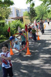 Затем дети приняли участие в следующих спортивных командных эстафетах и спортивных викторинах: «Продень обруч». «Змейка», «Прыжки», «Нора», «С кочки на кочку», «Лягушки», «Передай мяч», «Парочки», «Классики», «Прыжки в длину с разбега». викторина «Рифма», «Бюро находок» и увлекательные загадки. После пройденных эстафет и викторин детям необходимо было собрать пазл-карту своей площадки, разгадать загадки и найти подарок .