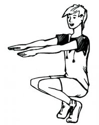 1. На выдохе пружинисто присесть и коснуться пола руками 3 раза.